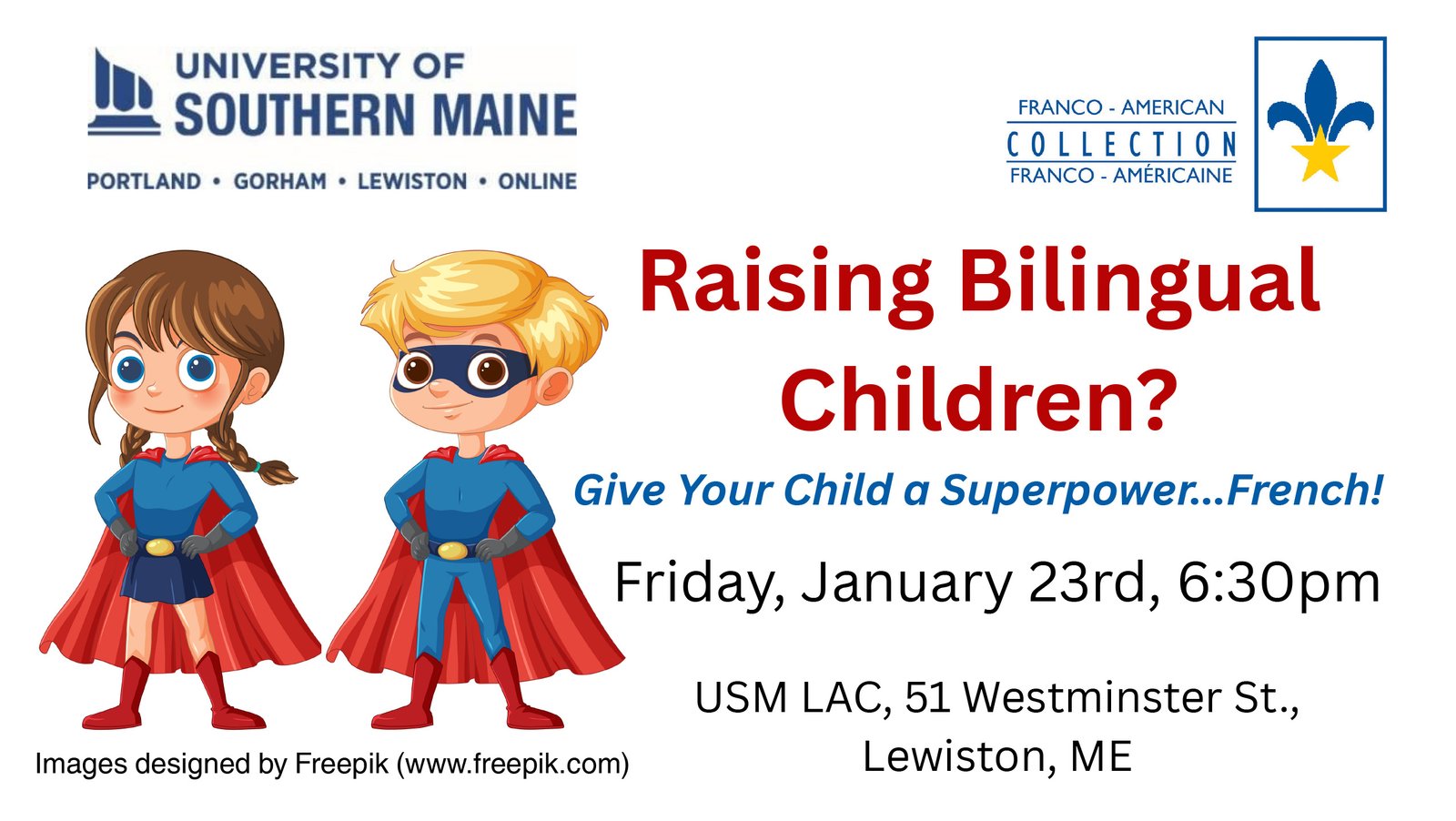 Join USM’s Franco-American Collection in-person for a community discussion about raising children who speak both French and English.